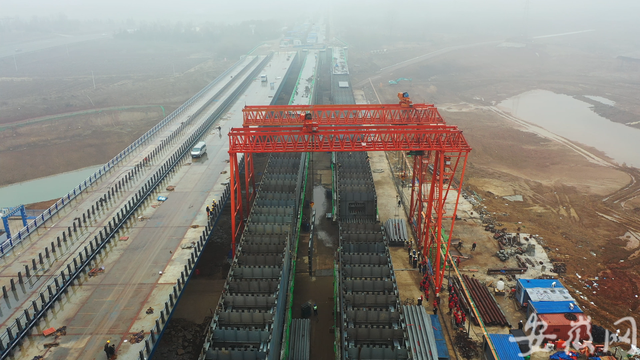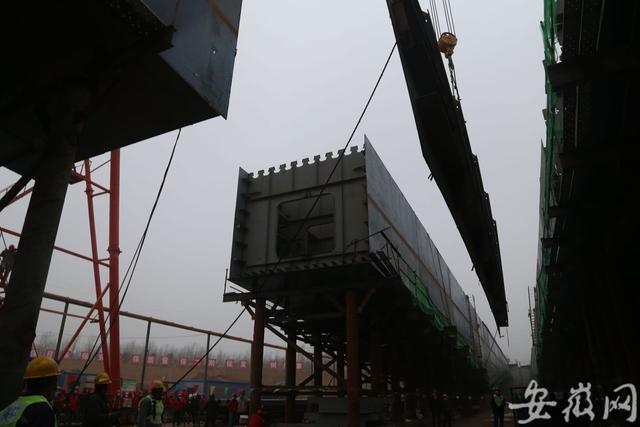 由于引江濟(jì)淮工程與G312合六葉公路相交,需新建一座公路橋跨越江淮運(yùn)河。記者在現(xiàn)場(chǎng)看到,大橋雛形已現(xiàn),工人們正在緊張施工?!癎312合六葉公路橋全長(zhǎng)280米,總用鋼量達(dá)1.6萬(wàn)噸,橋面總寬52.5米,最大跨度達(dá)180米、采用鋼箱梁結(jié)構(gòu),在同類鋼箱梁中主跨跨度居全國(guó)第二、安徽省第一?!敝需F五局引江濟(jì)淮項(xiàng)目負(fù)責(zé)人羅偉平介紹,鋼箱梁由四幅連續(xù)梁組成,每幅鋼箱梁采用100米+180米+100米的三跨結(jié)構(gòu)組成,其中3#、4#連續(xù)梁已于2020年4月份實(shí)現(xiàn)合龍。