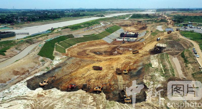 2020年8月7日航拍引江濟(jì)淮工程安徽省合肥市廬江縣萬(wàn)山鎮(zhèn)永橋村廬江船閘施工現(xiàn)場(chǎng)一片繁忙景象。