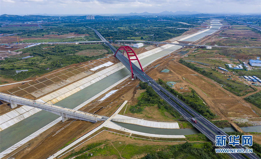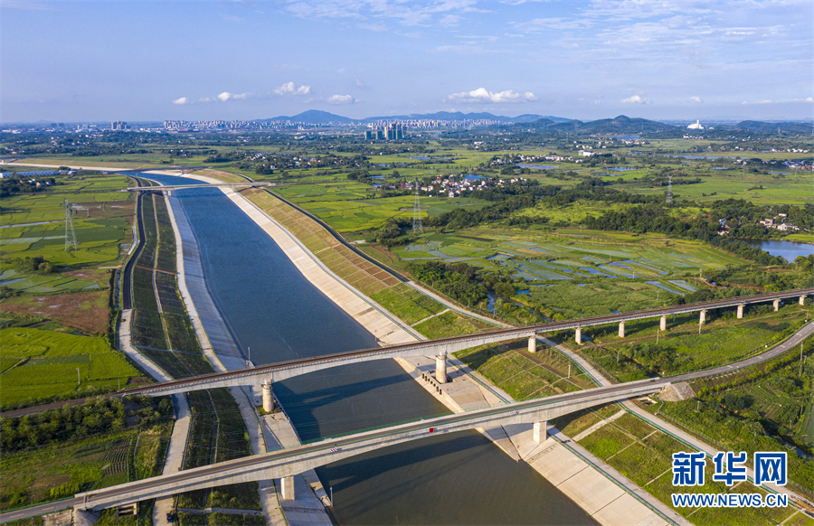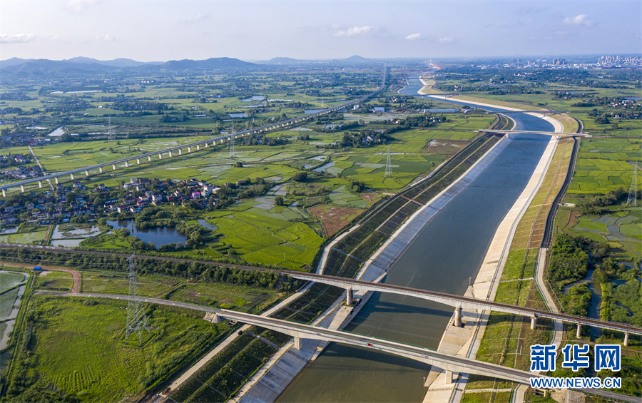 6月28日,安徽省合肥市廬江縣柯坦鎮(zhèn)境內(nèi)的引江濟淮工程雄姿展現(xiàn),河道、高鐵、公路在綠野中交匯,景美如畫。
