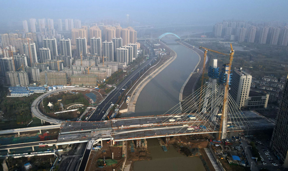 ↑這是正在進(jìn)行主塔封頂施工的引江濟(jì)淮金寨南路橋(11月24日攝,無人機(jī)照片)。