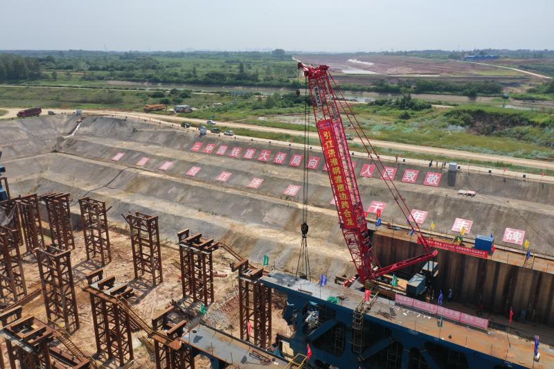 8月4日上午9時,淠河總干渠渡槽施工現(xiàn)場,一件重達76噸的鋼渡槽拱弦C11構件穩(wěn)穩(wěn)落下。